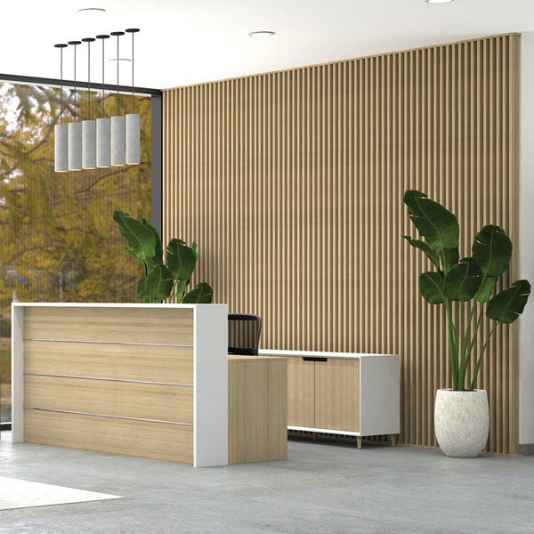 • White carcass with Classic Oak Naturale hinged doors with scallop cut for handles